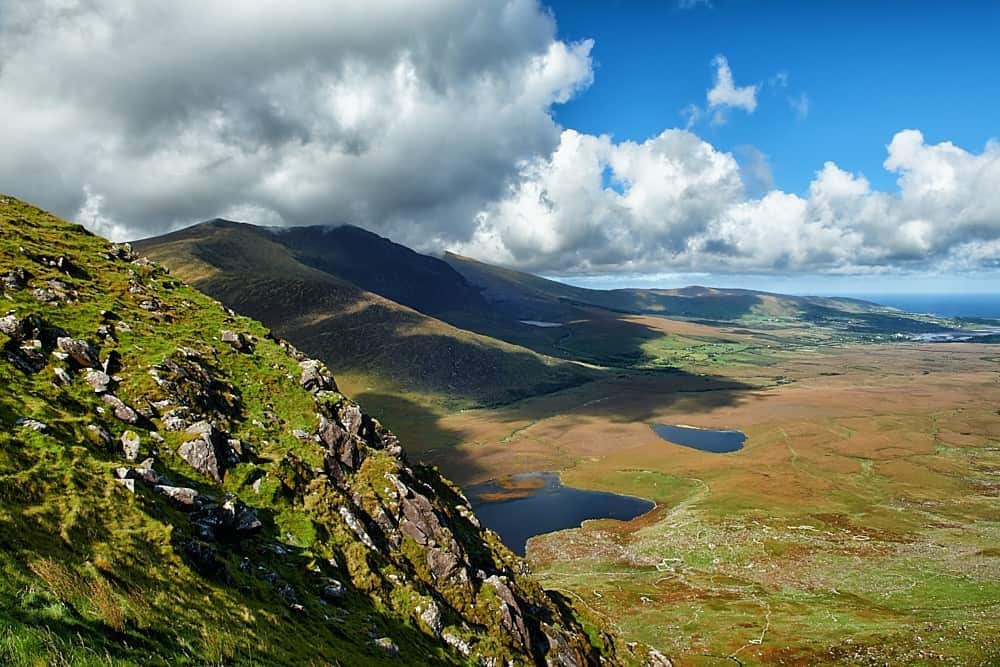 With 456 meters above sea level, the Conor Pass is Ireland’s highest mountain pass. A truly breathtaking view can be enjoyed at the parking area, from where Mount Brandon and Brandon Bay can be seen. The lakes down in the valley are remnants of the last ice age and are called kettle holes.